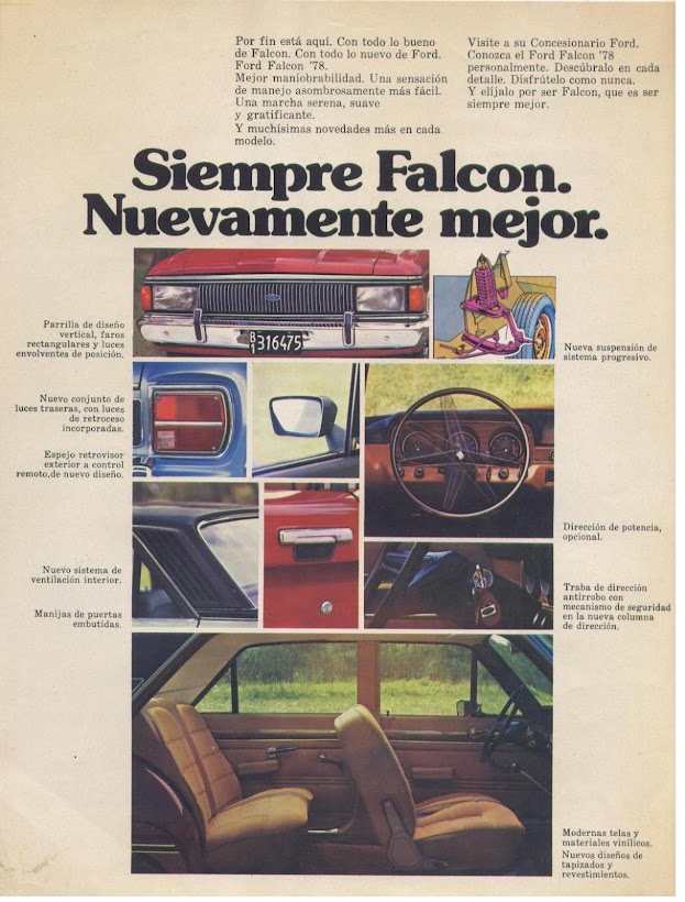 Todos estos recuerdos volvieron cuando me topé con este viejo folleto del Falcon `78. Un dato curioso, sobretodo para los más despiertos, el modelo de la tapa tiene una chapa-patente o matricula, que es igual a la del modelo de color rojo del interior del folleto. Además la patente indicaba que el auto estaba radicado en la provincia de Buenos Aires, por la "B" del comienzo.