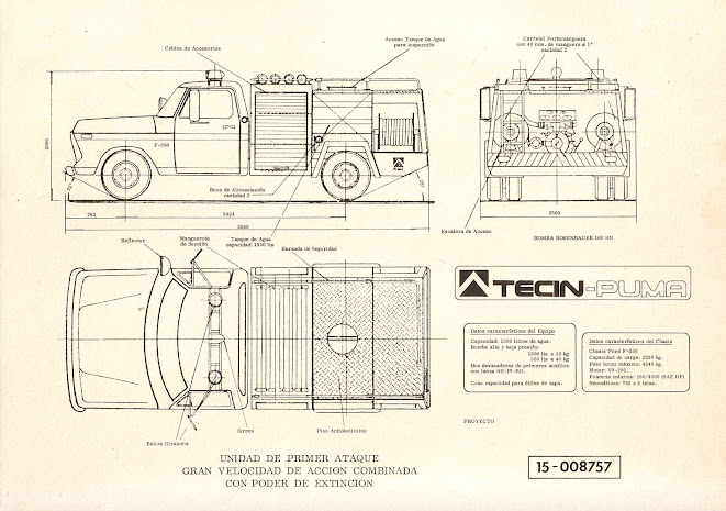 | Dibujo con tres vistas de la autobomba argentina Tecin-Puma TLF-1300 del año 1982 realizada por Tecin-Rosenbauer. Los dibujos fueron tomados de un folleto de la empresa Tecin-Rosenbauer SA. |