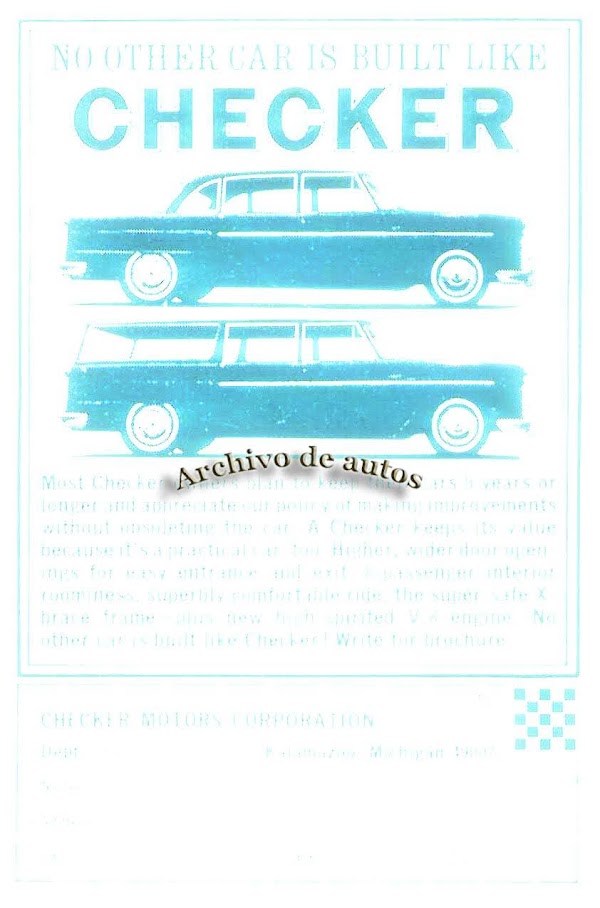 La empresa Checker Motors Corporation fabricó los conocidos taxis de Estados Unidos. Seguramente la mayoría de los lectores de Archivo de autos los conocen de series y películas. El contenido exclusivo, para los suscriptores, es una publicidad que tiene un cupón para solicitar un folleto. Ese documento, tomado de mi archivo personal, es del año 1966.